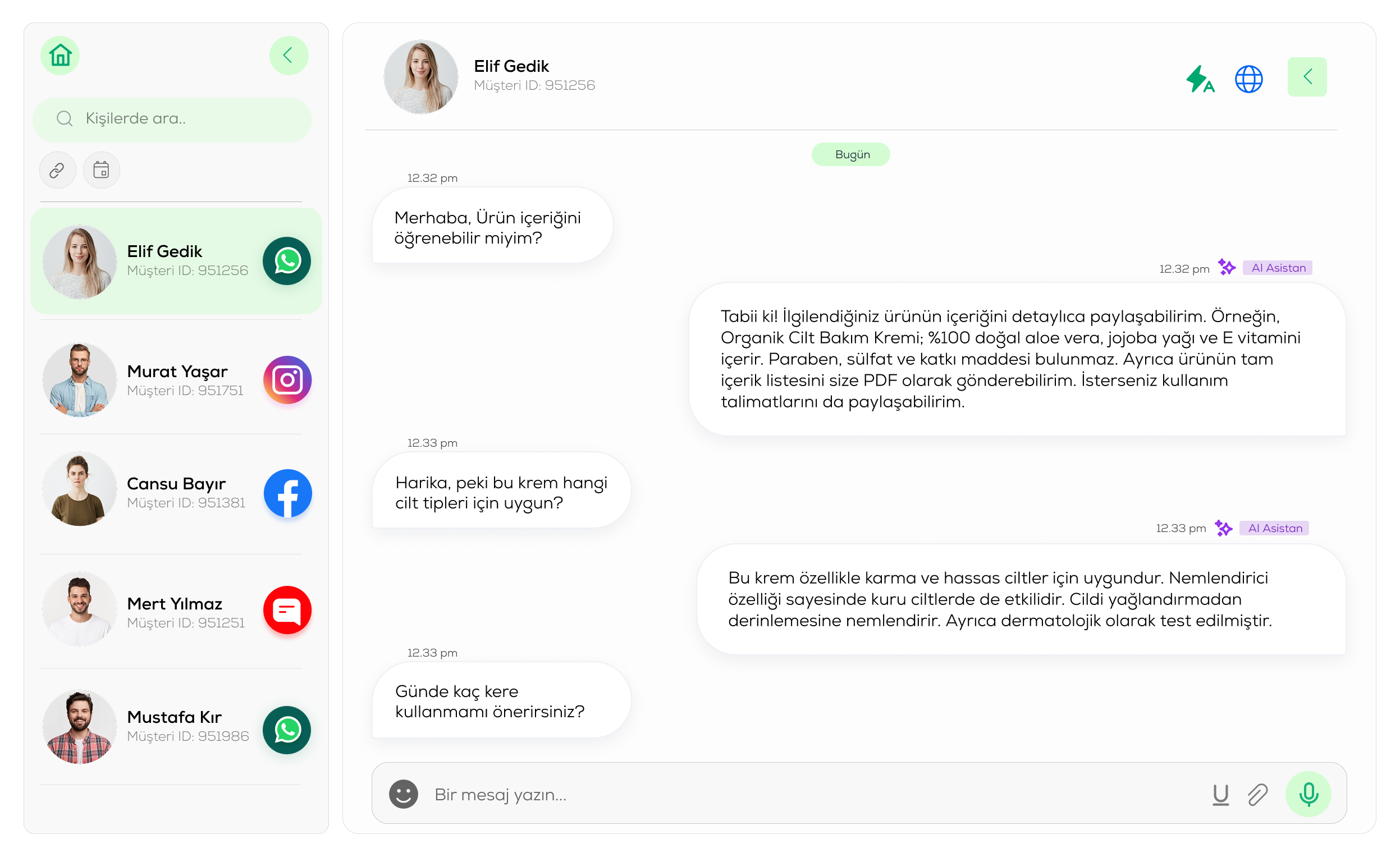 WhatsApp / WebChat / Instagram mesajlarını tek bir gelen kutusunda birleştirir; bağlam ve müşteri geçmişi korunur, ekipler çözüm süresini ~%40 kısaltır ve kanallarını kurulumu ≤5 dakikada canlıya alınır.