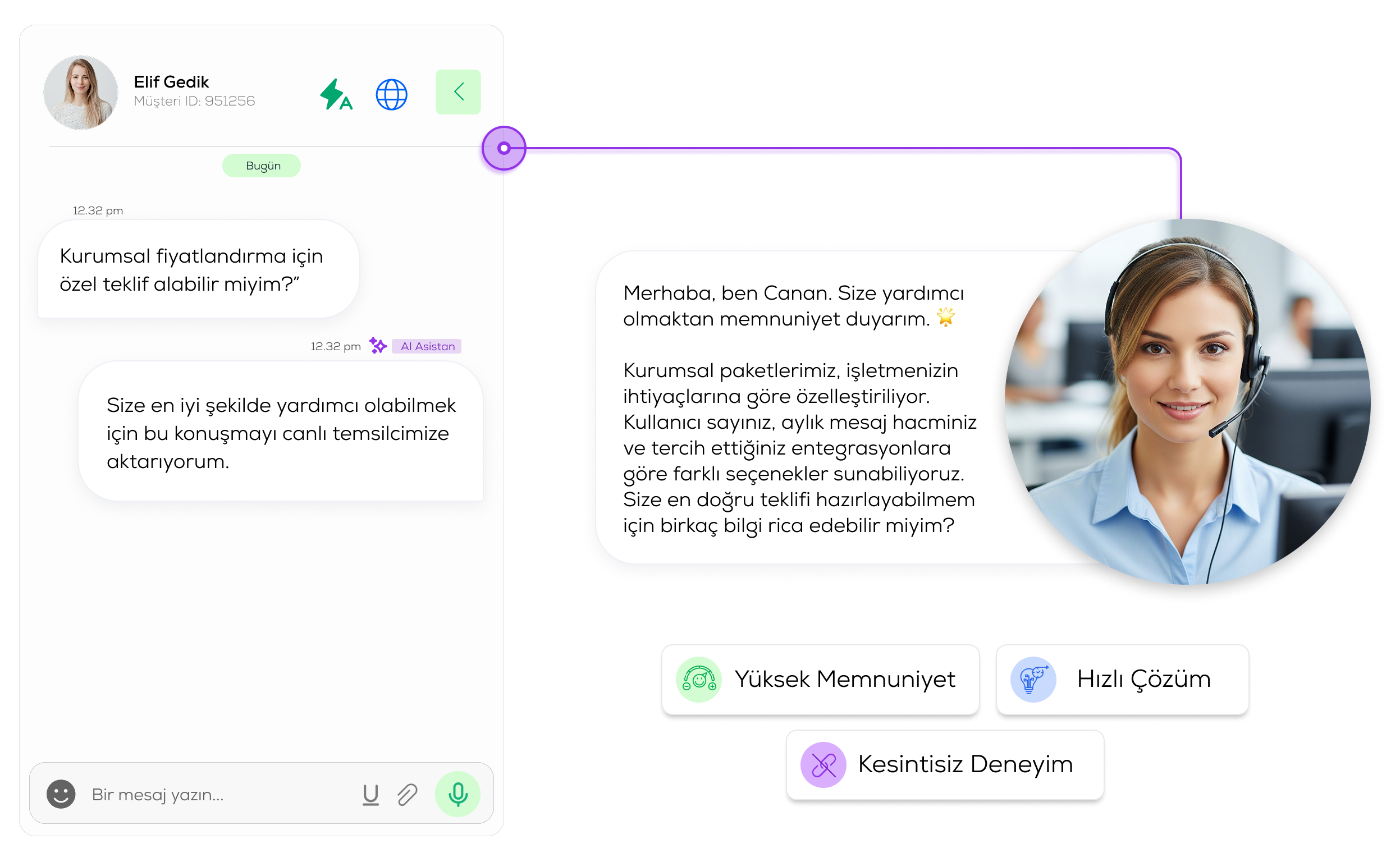 Caresept, AI'nın zorlandığı anlarda sohbeti bağlamı koruyarak temsilciye aktarır; görünür/görünmez aktarım seçenekleriyle deneyim kesintiye uğramaz. Sonuç: %100 ilk yanıt kapsamı (≤ 10 sn), yanıtsız mesaj yok, karmaşık vakalarda daha hızlı çözüm ve daha yüksek memnuniyet.