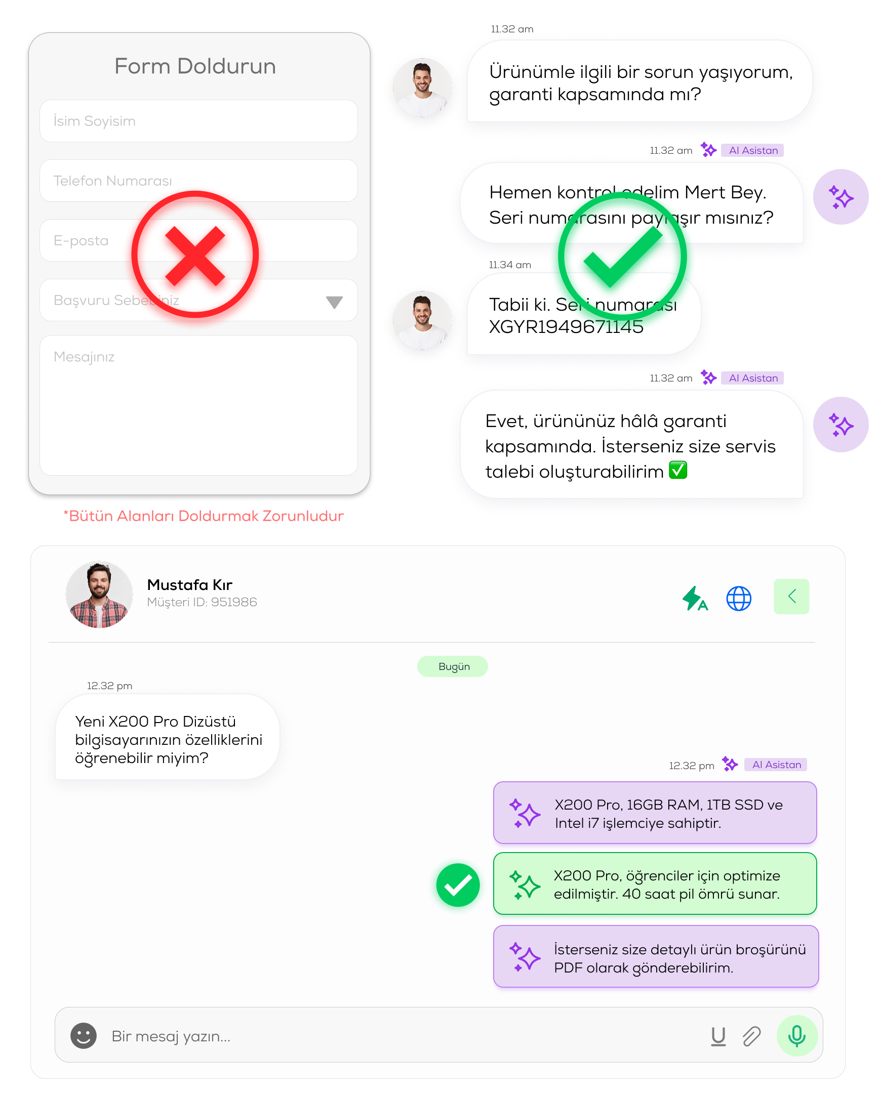 - • Senaryoya göre adım adım bilgi toplama (form yerine sohbetle)
